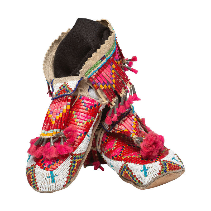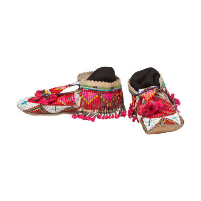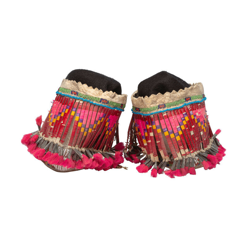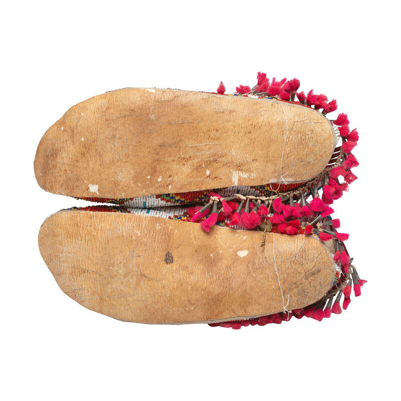 brightly quilled in colors of red, pink, green, white, orange, and blue; a wide beaded band around soles; tin cones filled with pink wool
