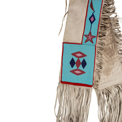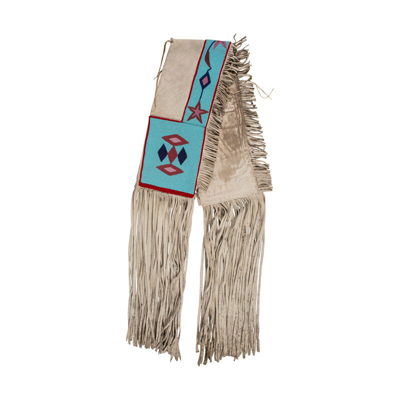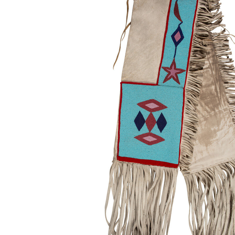 thread-sewn, thick softly tanned hide; beaded in colors of light blue, red white-heart, pink, and cobalt