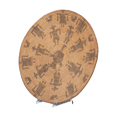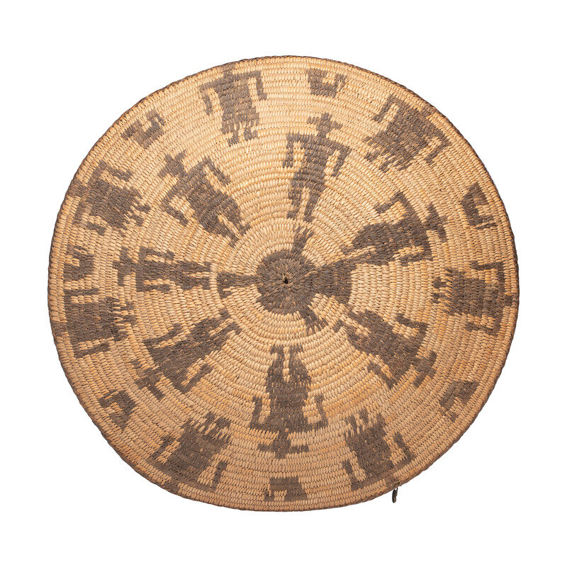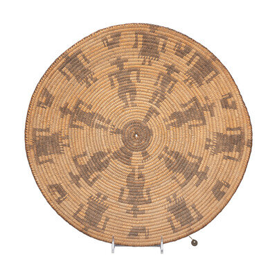 Akimel O'odham Figural Basketry Tray, Cowboys and Chickens