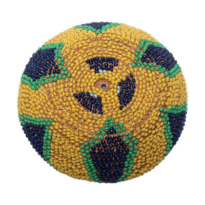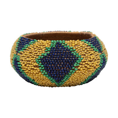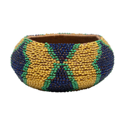 finely woven with exterior beaded in greasy yellow, cobalt, and green