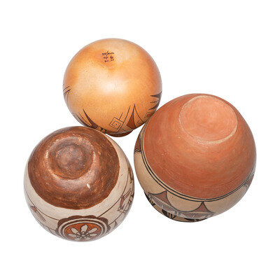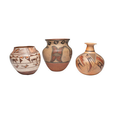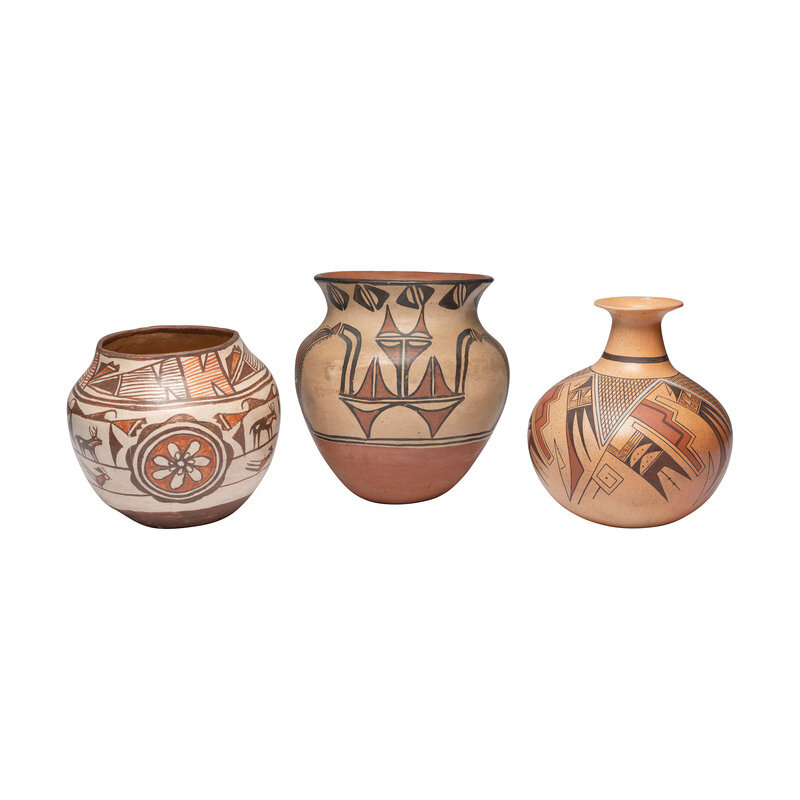a Zuni polychrome jar decorated with floral medallions, deer, and birds