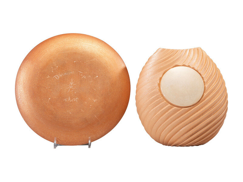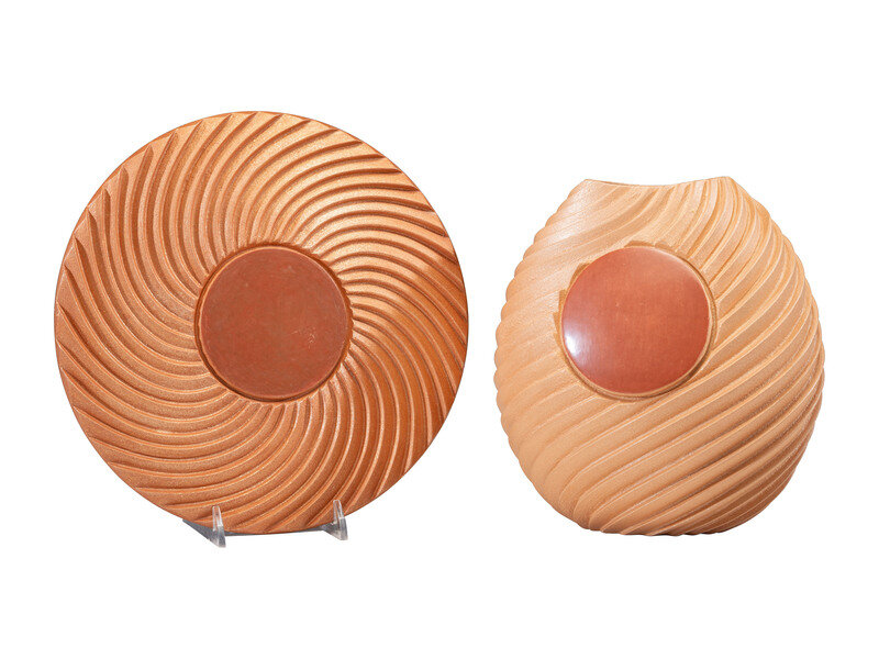 a vase with 24 ribs and with a single red and buff polished medallion; signed on base, height 7 inches x width 7-1/4 inches x width 5 inches