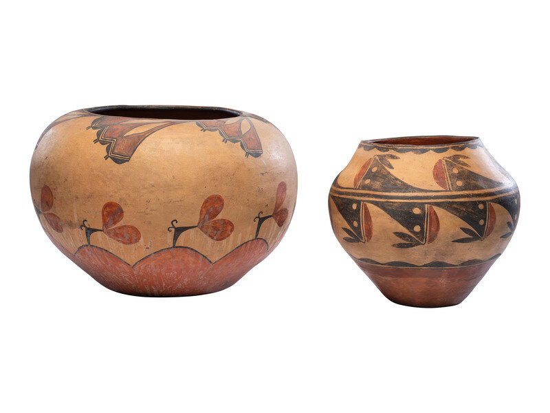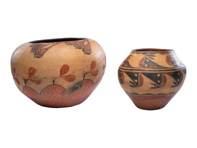 a larger jar with winged elements along the rim and floral elements along a scalloped lower edge; not signed