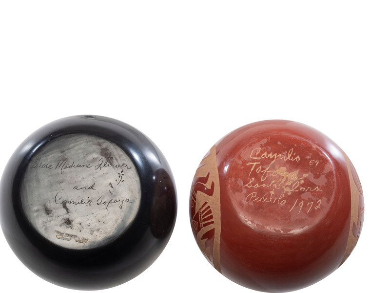 a redware jar; signed Camilio Tafoya Santa Clara Pueblo 1972; height 3-1/8 inches x diameter 3-1/4 inches