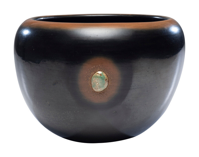 Black and Siena Pottery Jar, with Turquoise, 1974