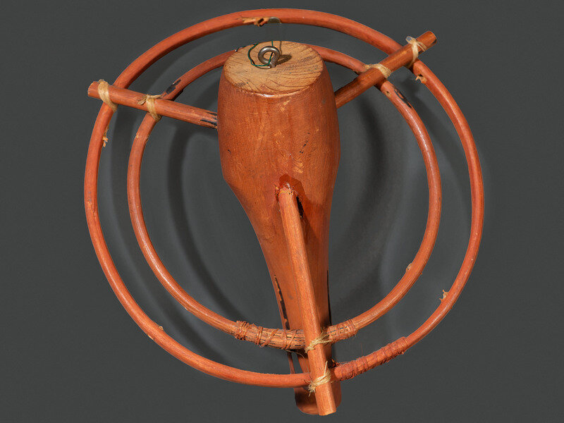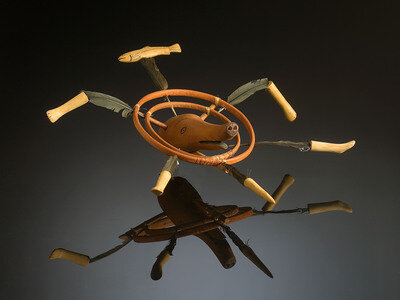 with pair of red washed wooden rings encircling a wolf's head, black painted features; radiating from center ring are six carved wooden emblems of legs, fish, and harpoon