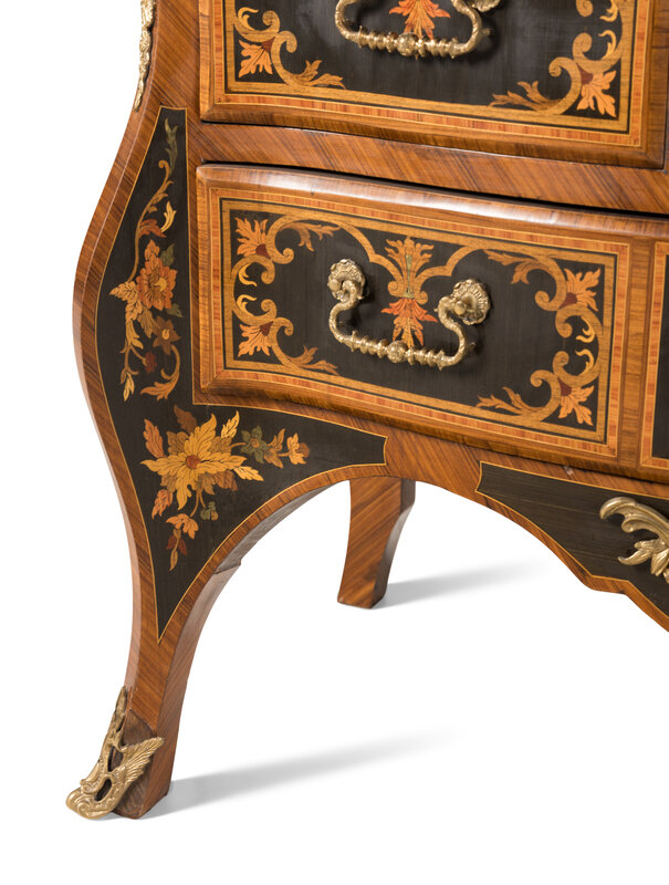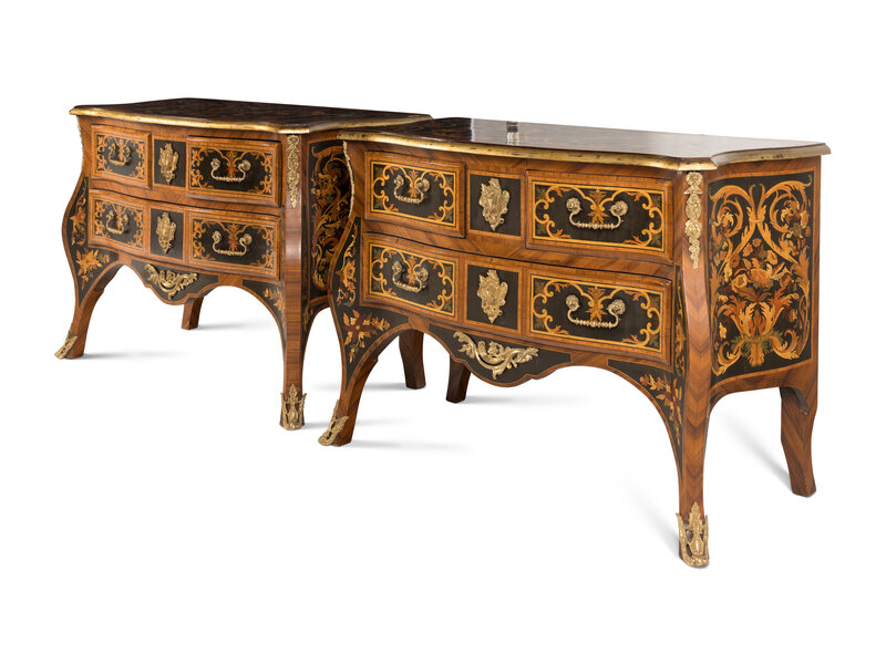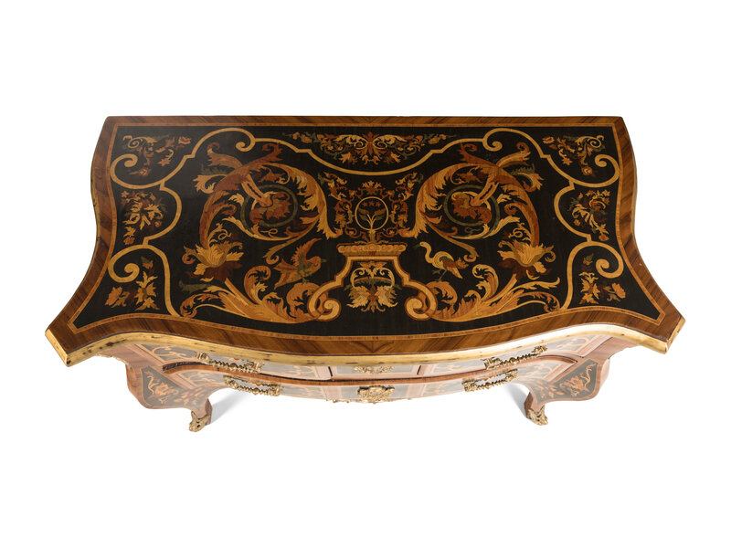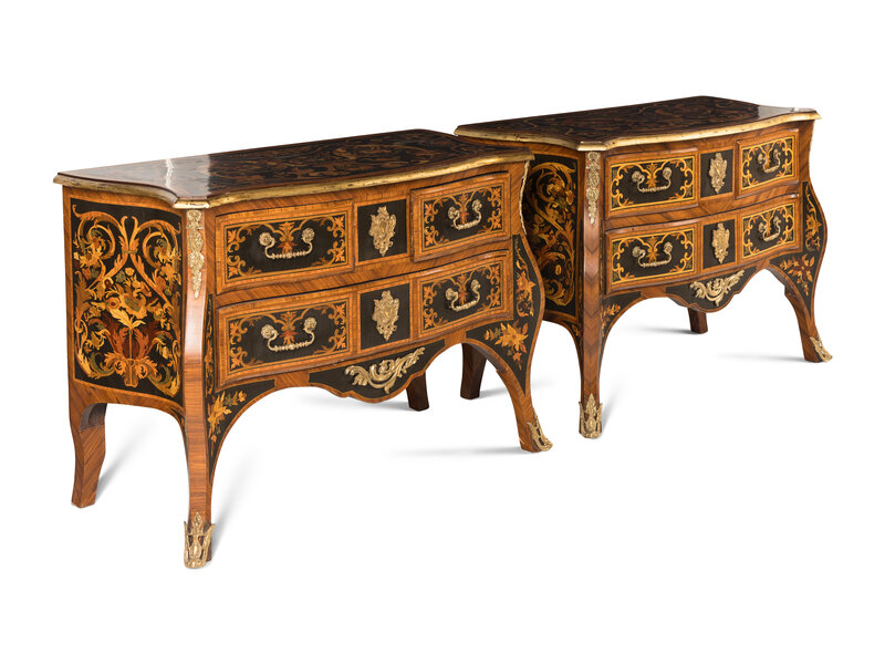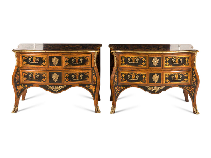 A Pair of Louis XIV Style Gilt Bronze Mounted Marquetry Commodes