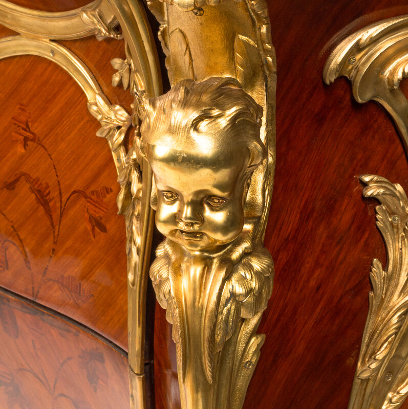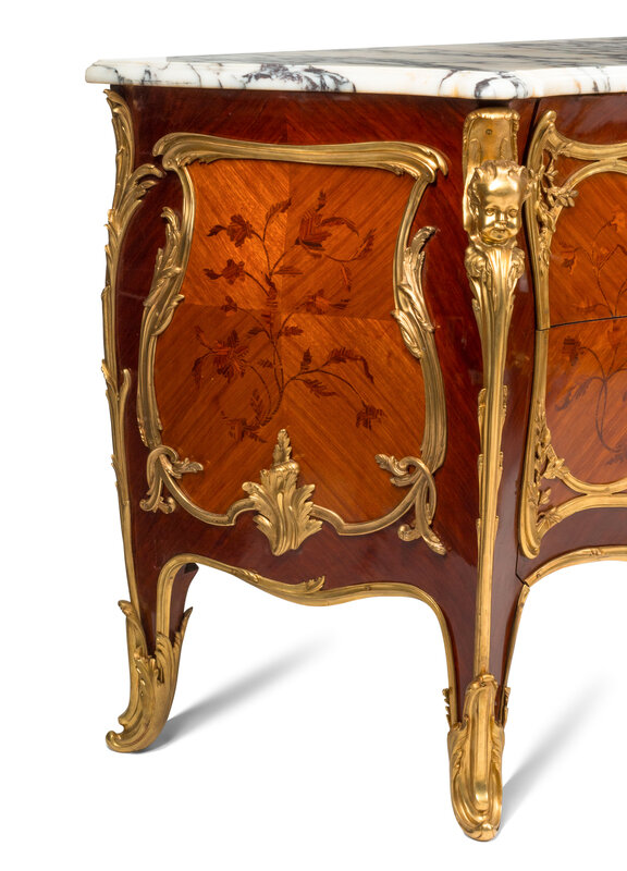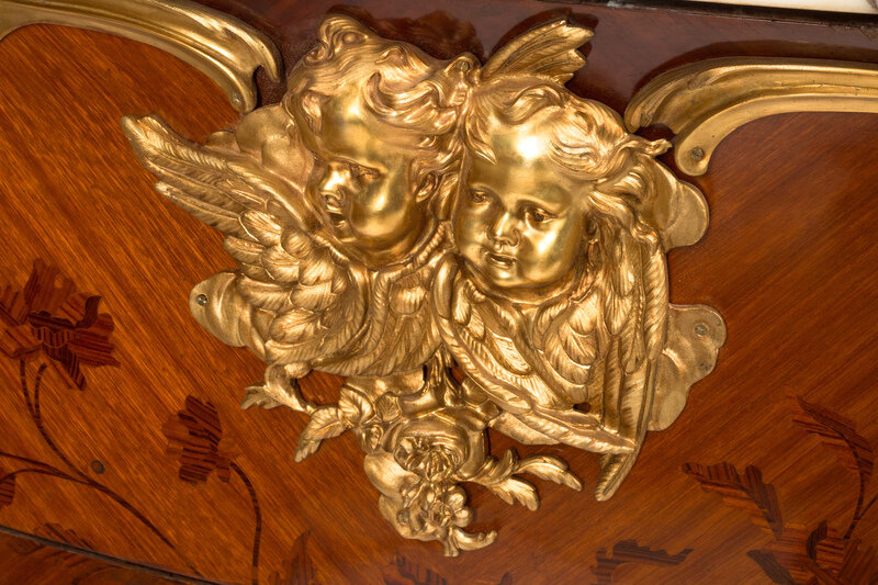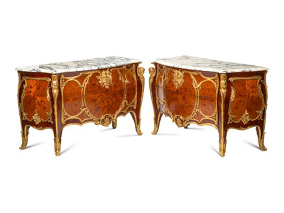 A Pair of Louis XV Style Gilt Bronze Mounted Marquetry Marble-Top Commodes