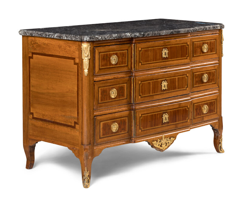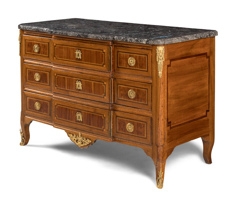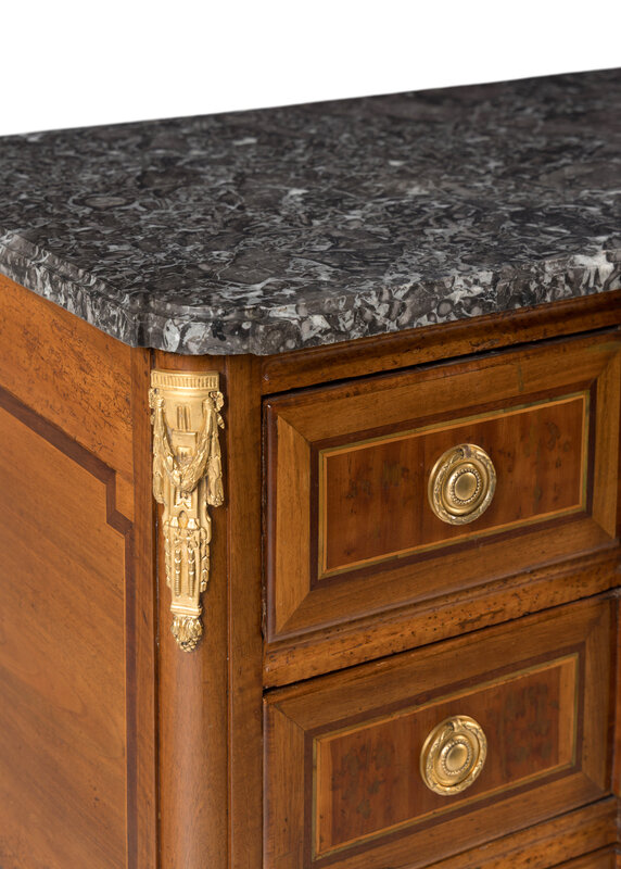 A Louis XV/XVI Transitional Gilt Bronze Mounted Walnut Marble-Top Commode