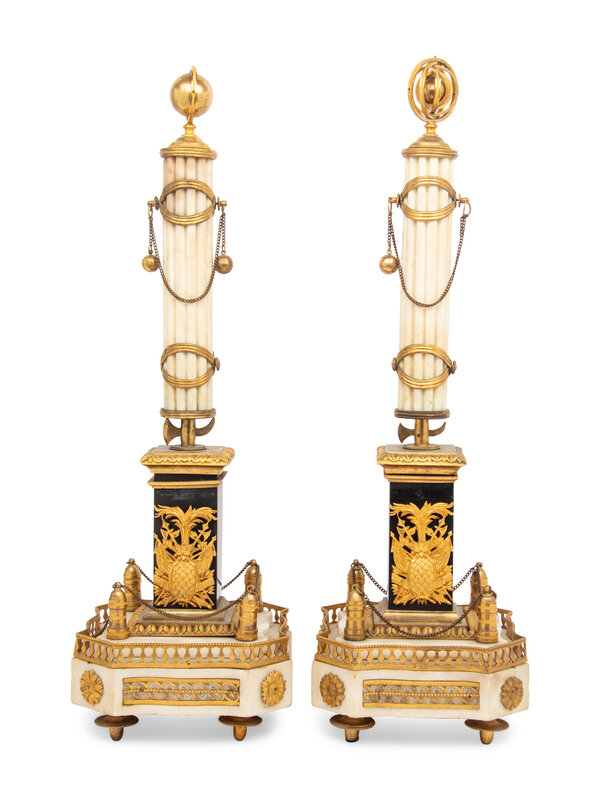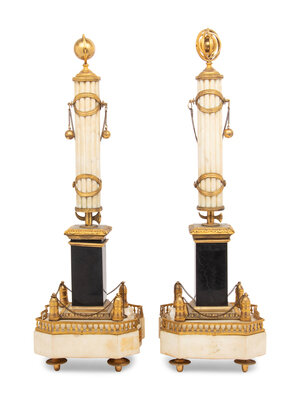 A Pair of Louis XVI Gilt Bronze Mounted Slate and White Marble Obelisks