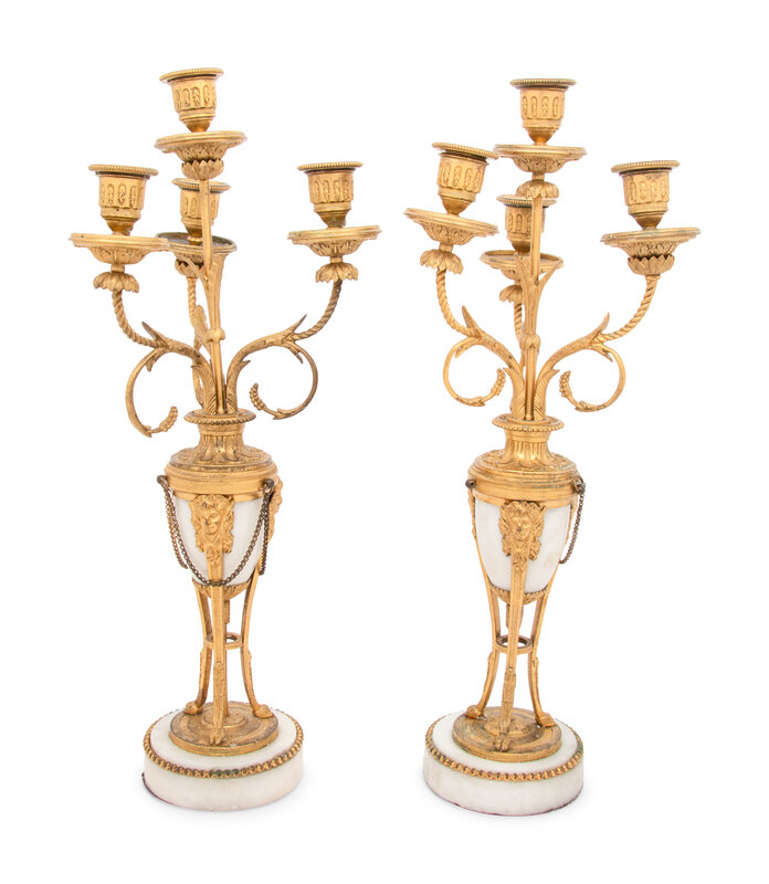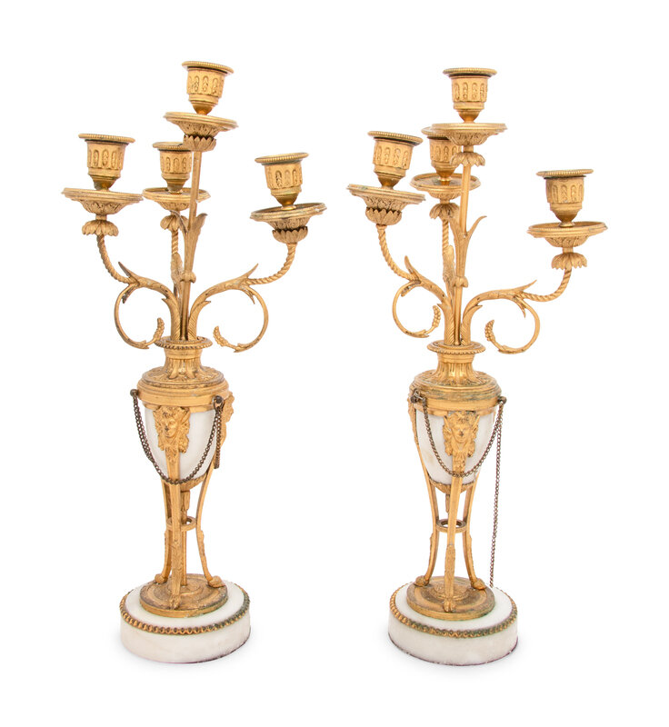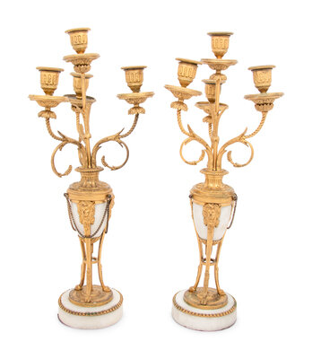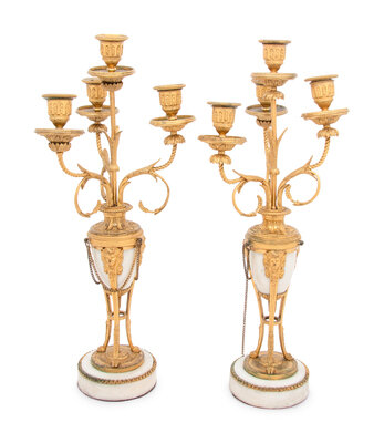 A Pair of French Gilt Bronze and Marble Four-Light Candelabra