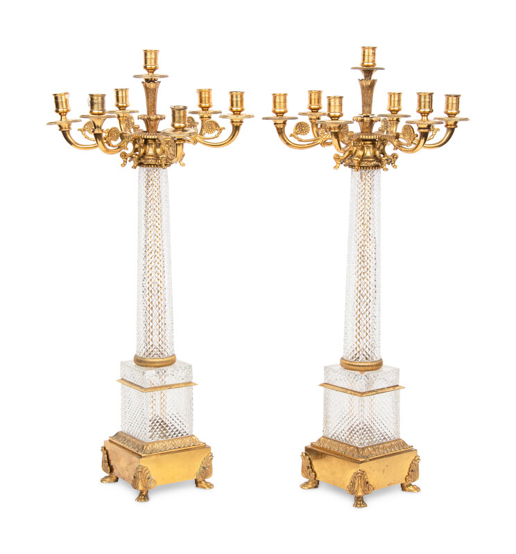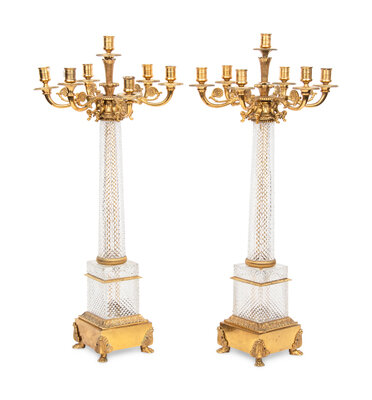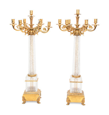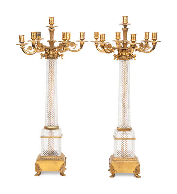 A Pair of Louis-Philippe Style Gilt Metal Mounted Cut Glass Seven-Light Candelabra