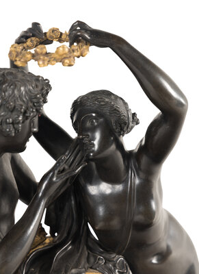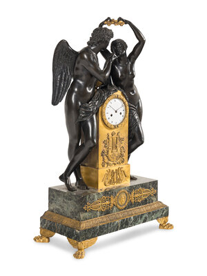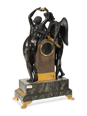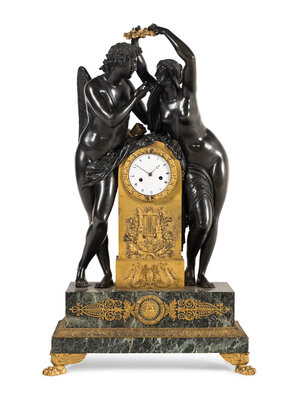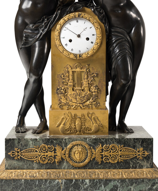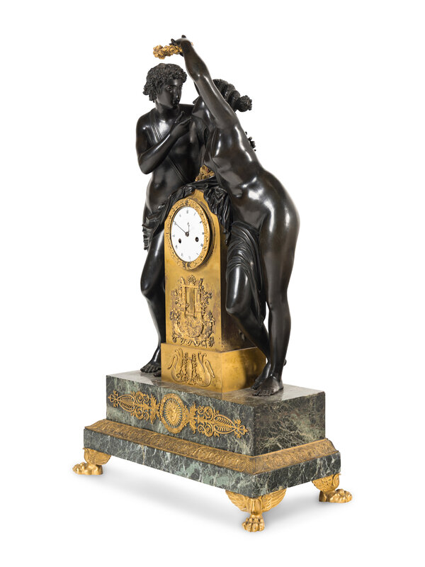 A French Parcel Gilt and Patinated Bronze Figural Mantel Clock