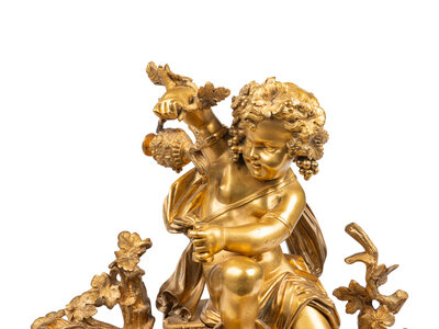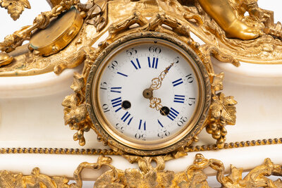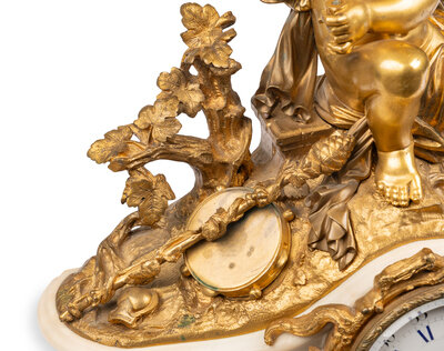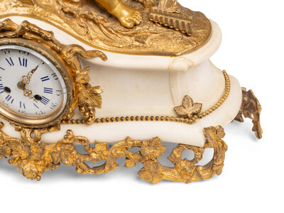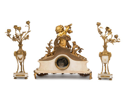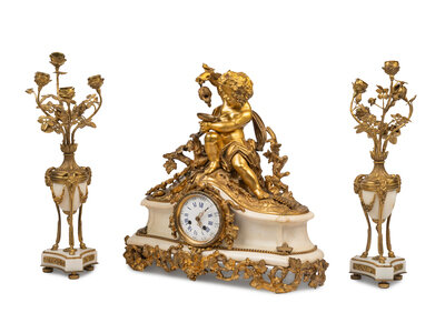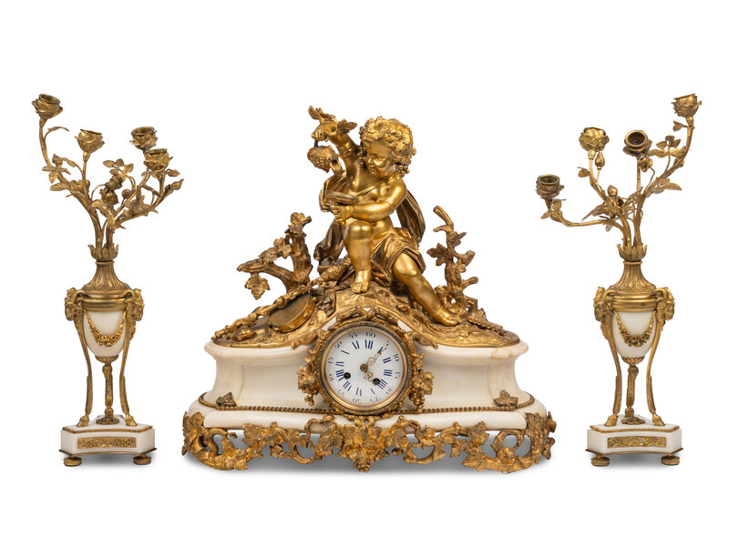 An Assembled French Gilt Bronze Mounted Marble Three-Piece Clock Garniture