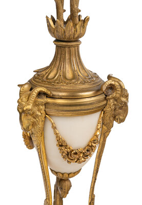 Height of clock 19 x width 20 x depth 9 inches; height of candelabra 19 inches.