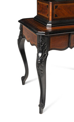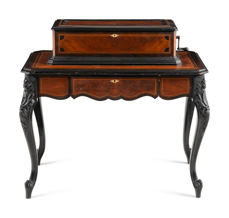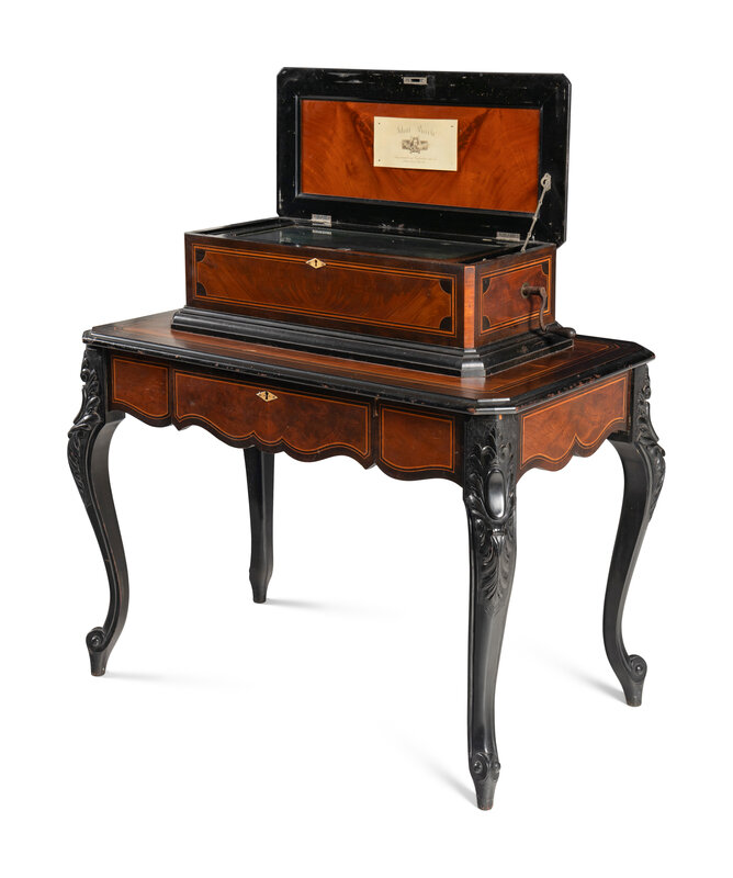 serial no. 3336-18, with four 11-inch cylinders, playing 6 airs each, with tune selector, in walnut banded and ebonized case on matching table with cylinder drawer and carved cabriole legs.
