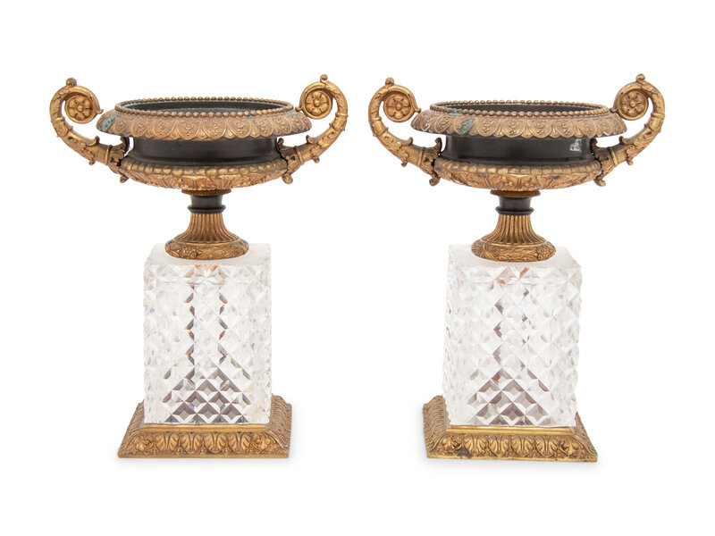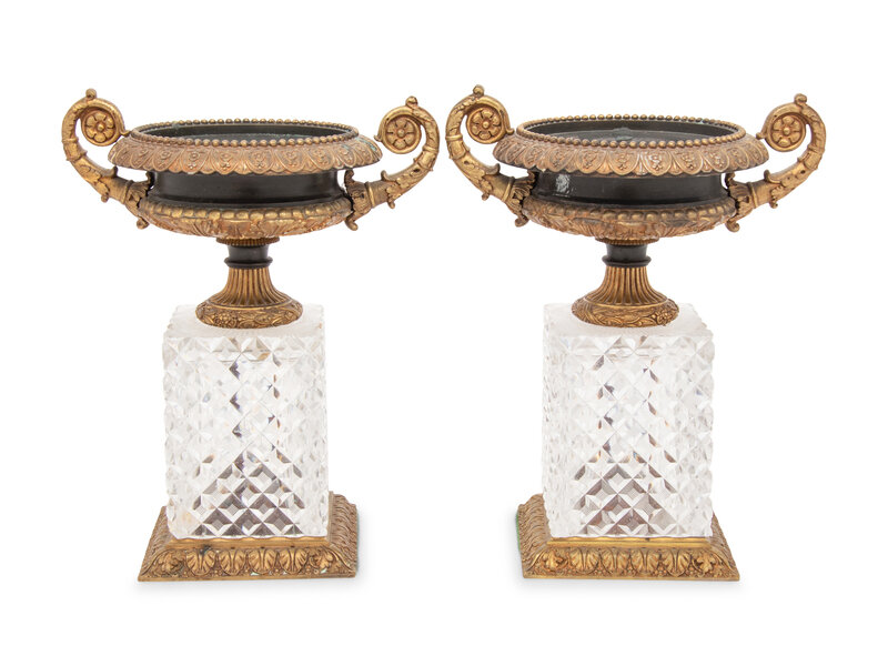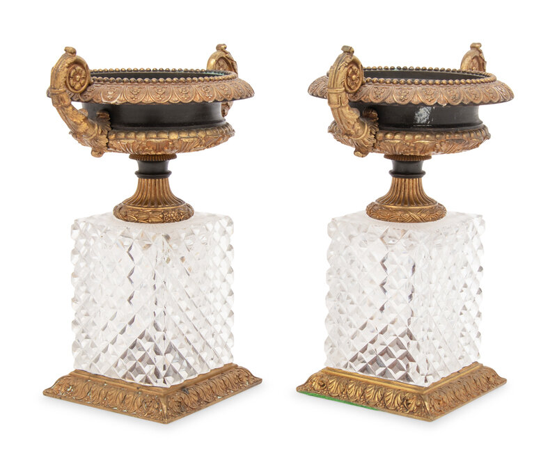 A Pair of French Gilt and Patinated Bronze and Cut Glass Urns