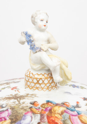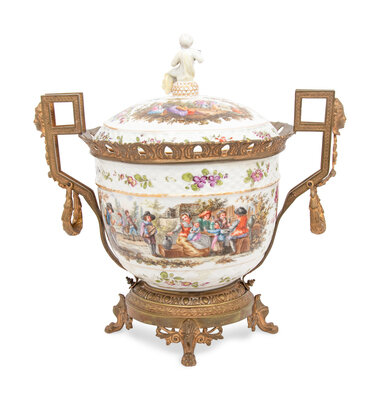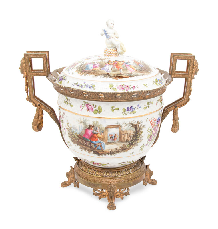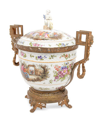 A Continental Gilt Metal Mounted Porcelain Covered Urn