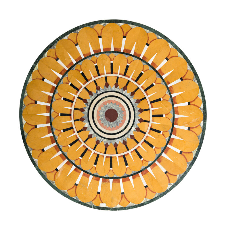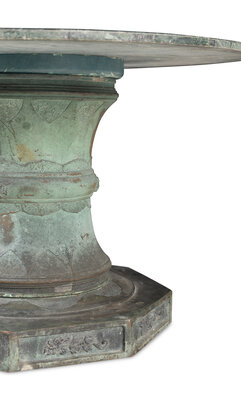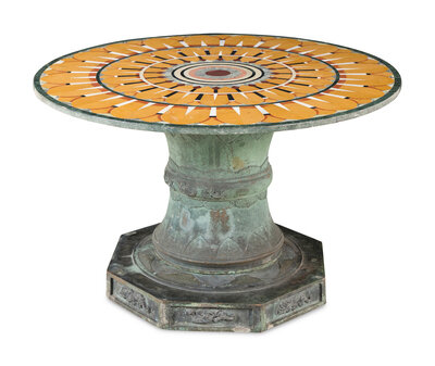A Continental Specimen Marble Table Top with an Associated Verdigris Bronze Base