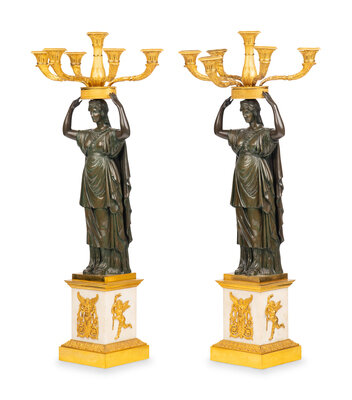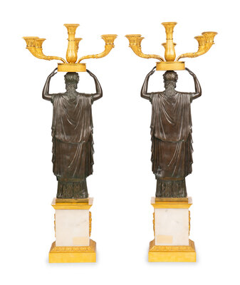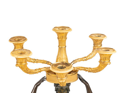 A Pair of Italian Gilt and Patinated Bronze and Marble Six-Light Candelabra