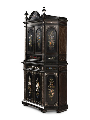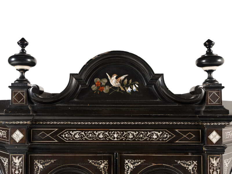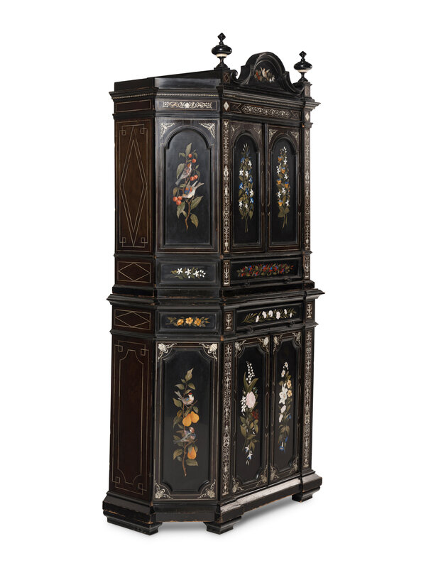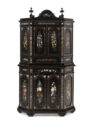 An Italian Marquetry and Pietra Dura Plaque Mounted Ebonized Cabinet