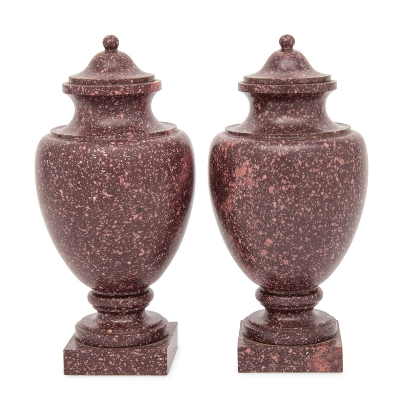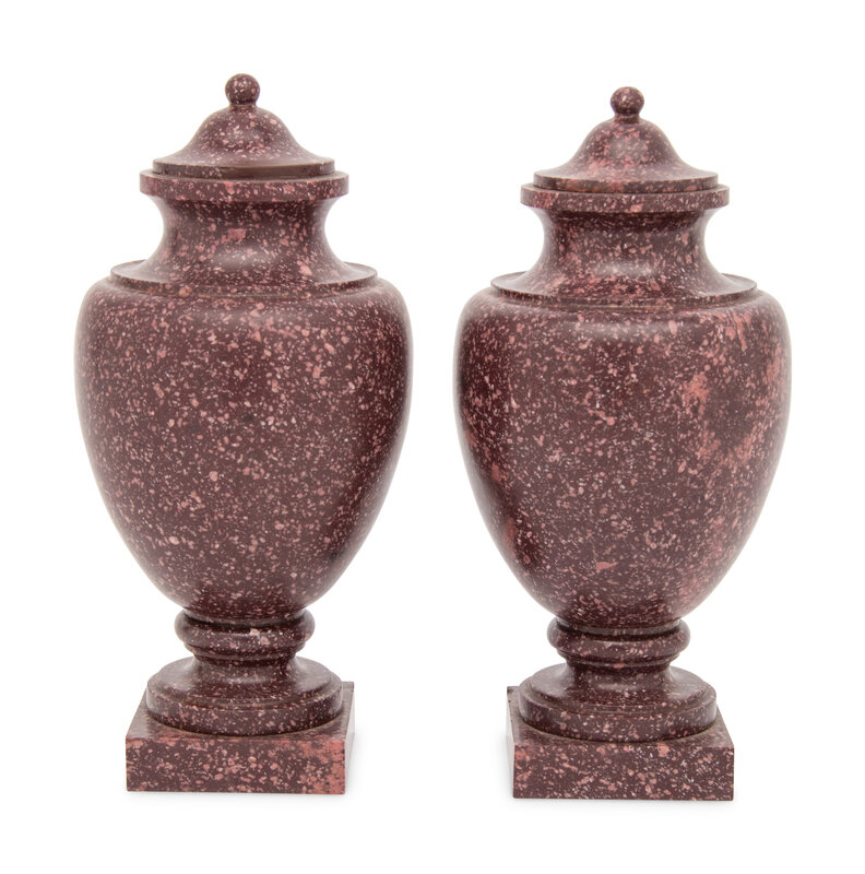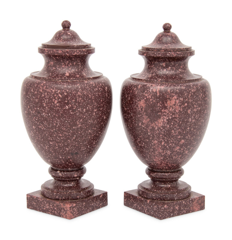 A Pair of Neoclassical Style Carved Porphyry Covered Urns