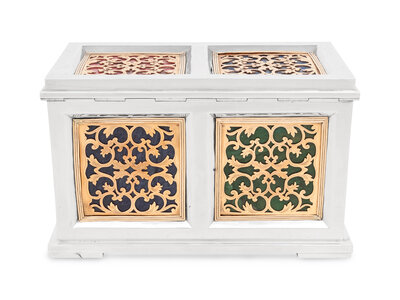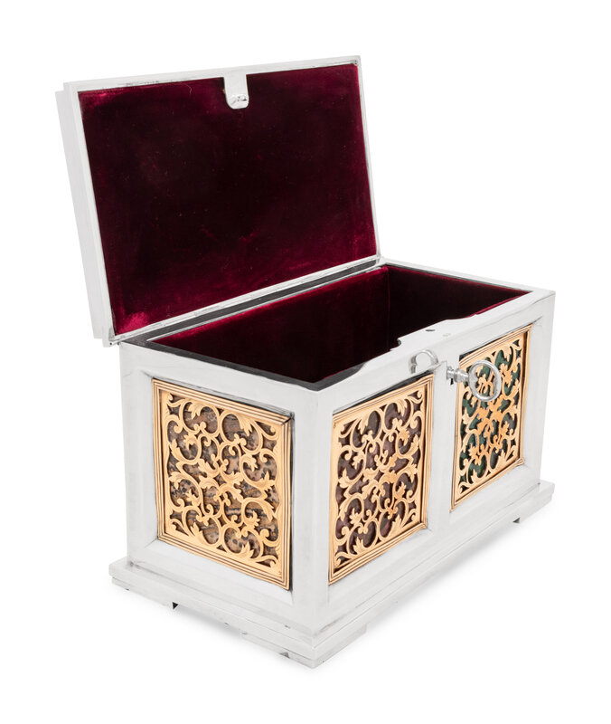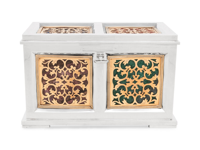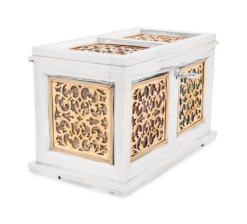 A Continental Baroque Style Silvered and Gilt Metal and Marble Inset Table Casket