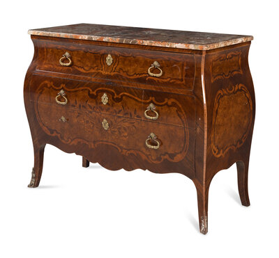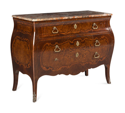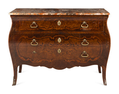 An Italian Walnut and Marquetry Marble-Top Bombé Bureau Commode