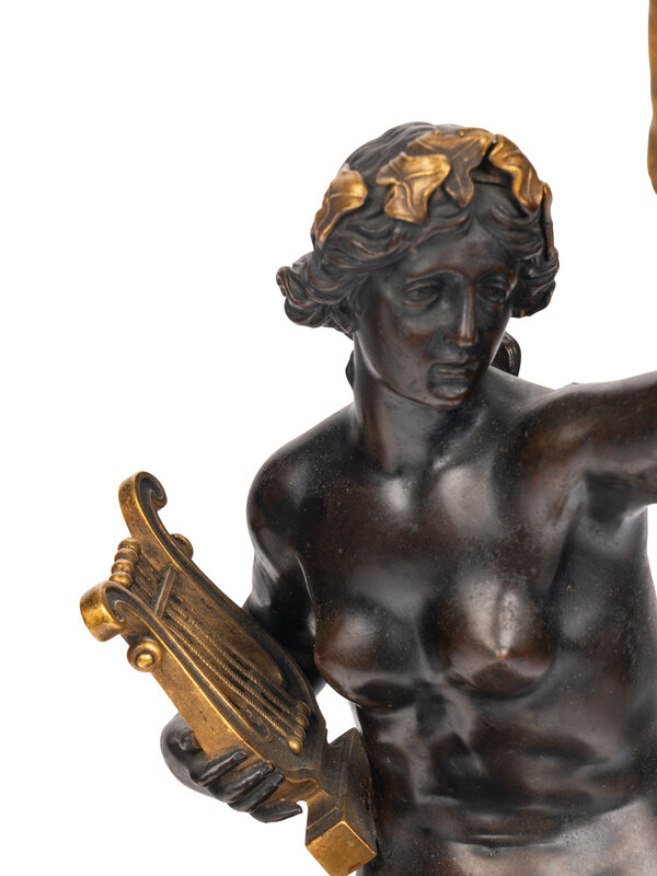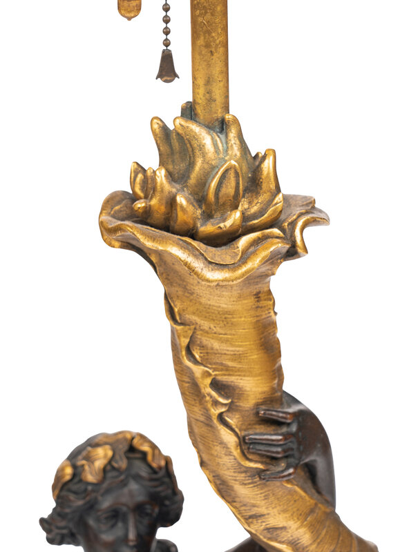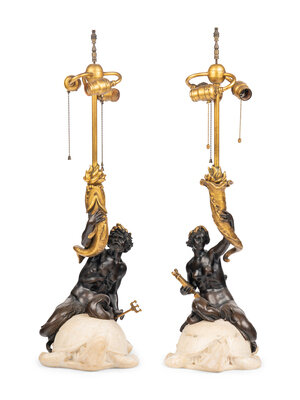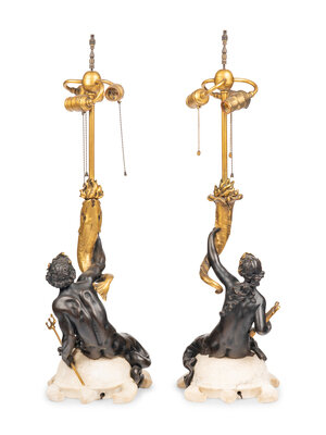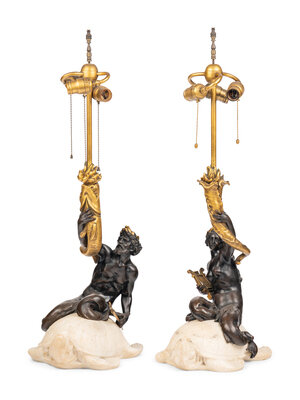 A Pair of American Gilt and Patinated Bronze and Carved Marble Figural Table Lamps
