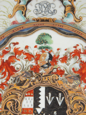 painted in the center with the arms of Okeover quartering Byrmingham (probably) and Leake and impaling Nichol, the rim elaborately decorated with four rococo cartouches, either inscribed with the LMO monogram or painted with a dragon crest above a crown