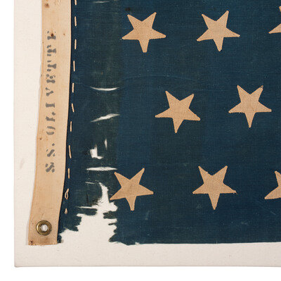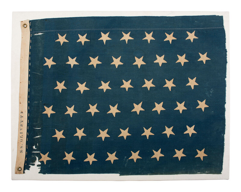 29 x 38 in. cotton canton with 45 double-appliquéd, cotton stars configured in horizontal rows 7/8/7/8/7/8. Canvas hoist with two brass grommets, stamped "SS Olivette." Mounted to 31 3/4 x 41 in. canvas.