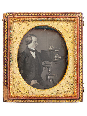 [EARLY PHOTOGRAPHY]. Sixth plate daguerreotype of a photographer posed with an American-made chamfered box camera atop a wooden tripod.