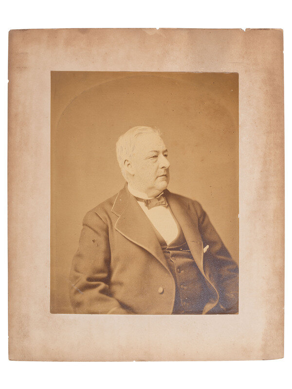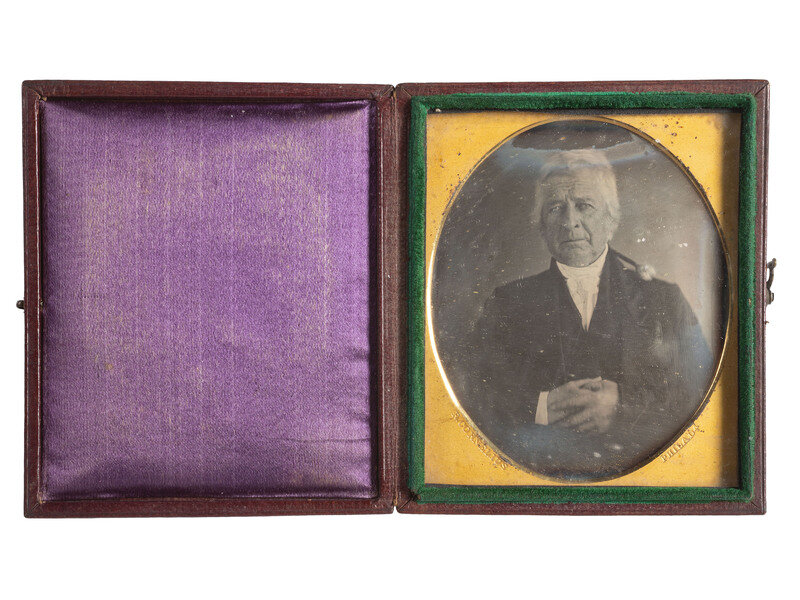 [With:] 7 typewritten pages of genealogy information about the Kennedy, Martin, and Jenkins families (largely) of Philadelphia and Baltimore. -- And 6 3/4 x 8 3/4 in. albumen portrait of an unknown man, with "D[?] Anderson" blindstamp to lower left, on 10 x 12 in. mount with fully detached mat. -- Together, 2 items, both of which were acquired with the daguerreotype, according to the consignor.