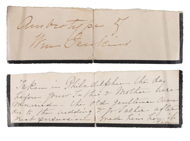 Image accompanied by a scrap of paper with ink inscriptions to both sides, erroneously identifying the image as an "Ambrotype of Wm Jenkins" on one side, and explaining the circumstances thusly on the other: "Taken in Philadelphia the day before your Father & Mother were married - the old gentleman came on to the wedding & yr Father after great persuasion made him have it taken."