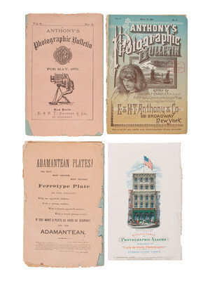 2 volumes of Anthony's Photographic Bulletin, being Vol. 6 No. 5 (May 1875) and Vol. 17 No. 5 (March 1886). Both with original wrappers, but the 1875 volume is almost completely disbound, with heavy chipping and losses to wrappers and wear to page edges. 1886 volume with front wrapper disbound. -- Disbound page from an unknown volume advertising E. Anthony's 501 Broadway location with colored engraving and text describing Anthony as a "Manufacturer of Photographic Albums, Publisher of Carte de Visite Photographs and Stereoscopic Views." There is a significant separation extending from the left edge of the advertisement through more than half of the page. -- Together, 3 printed materials.
