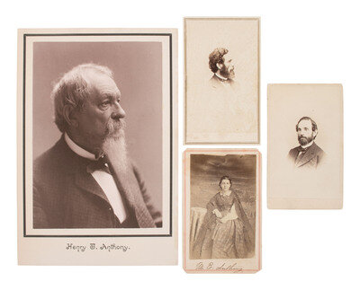2 CDVs featuring vignetted bust portraits of Edward Anthony, one capturing him in profile (uncredited) and the other capturing him at a slight frontal angle (Philadelphia: James Cremer's Portrait Rooms). -- CDV portrait of a woman identified on mount as "M. E. Anthony," posed sitting before a studio backdrop featuring rows of tents and a river winding through tree-lined landscape. Uncredited. -- Cabinet-sized silver gelatin bust portrait of Henry T. Anthony in profile. Uncredited, but on a mount with his name printed below a thick black (possibly mourning) border surrounding the portrait. Verso bears penciled date, "1884," which is the year Henry died. -- Together, 4 images.