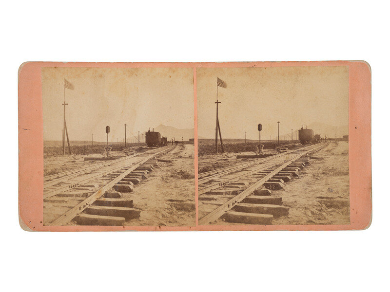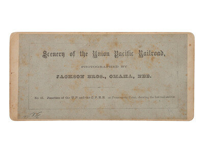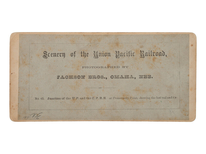 Stereoview on salmon colored mount with applied paper label to verso bearing series title, photographer's credit, image number and title. In full: "Scenery of the Union Pacific Railroad, / Photographed by / Jackson Bros., Omaha, Neb. / No. 65. Junction of the U.P. and the C.P.R.R.—at Promontory Point, showing the last rail and tie."