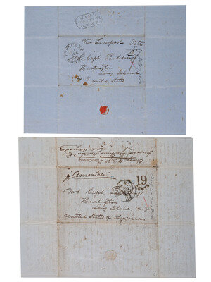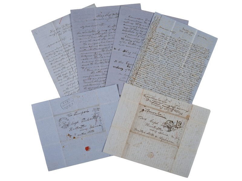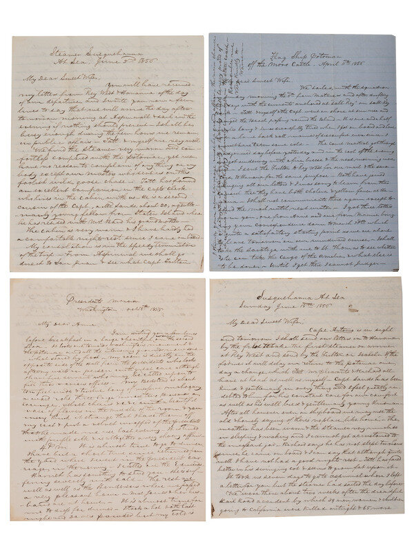 Group of 56 letters written by United States Naval officer Hiram Paulding to family members, including 49 letters to his wife Ann Marie Kellogg Paulding (1807-1894), one letter to his daughter Anna Marie Paulding (1832-1906), and six letters to his son Tattnall Paulding (1840-1907). Additional family correspondence includes four letters to Hiram Paulding from his children, one each from Anna, Tattnall, Hiram Jr. (1846-1924), and Mary Paulding (1842-1912), and a letter from Tattnall Paulding to his sister Anna. Paulding's family correspondence demonstrates not only his implacable sense of duty to the United States Navy and commitment to the nation he served, but also his deep, abiding affection for his family. Correspondence spans 1849-1876 (bulk 1850-1856). Letters generally 2-3+pp, some with integral address leaf and associated postal markings. Various places incl. "At Sea," Lisbon, Bay of Palermo, Navy Yard Washington, Key West, Havana, Matanzas, and Long Island, and aboard the "Flag Ship Potomac," "US Frigate St. Lawrence," and "Steamer Susquehanna."