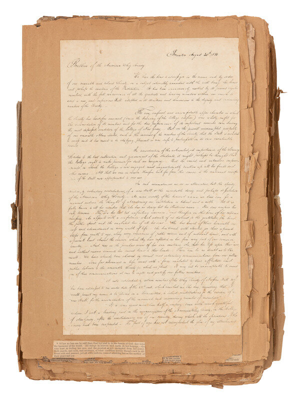 The circular opens with its purpose: "We have the honor to address you in the name and by the order of our valuable and beloved Society, on a subject intimately connected with the well being the honor and perhaps existence of the Institution. It has been unanimously resolved by its present regular members, with the full concurrence of all the graduate and honorary members within our reach to erect a new and capacious Hall adapted in its structure and dimensions to the dignity and increasing numbers of our Society." The circular concludes with the names of prominent figures who were Whig Society members while at the College of New Jersey, including: Mahlon Dickerson (1770-1853), seventh governor of New Jersey, US Senator, and US Secretary of the Navy; Thomson F. Mason (1785-1838), judge, politician, and grandson of George Mason; Richard H. Bayard (1796-1868), a member of the Whig Party and US Senator from Delaware; John R. Livingston, Jr. (1803-1871), of the prominent New York Livingston family; and Philip C. Pendleton (1779-1863), a Virginia attorney and planter, from one of the First Families of Virginia. The subsequent appeal from current Whig Society undergraduate members states: "The project of erecting a new Hall is not only of vital importance to the Society itself, but also forms an essential part of of a system of improvements commenced by the Alumni, and intended to render our College not inferior to any institution of the kind in this country." The appeal is signed by James Carnahan, Joseph Henry, Richard S. Field, James E. Green, A. Alexander, Samuel Miller, C. Hodge, James W. Alexander, and Jonathan Breckenridge.