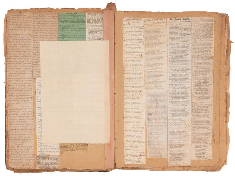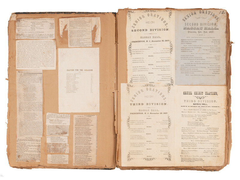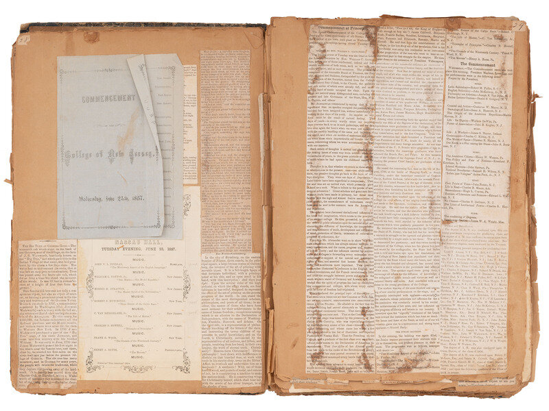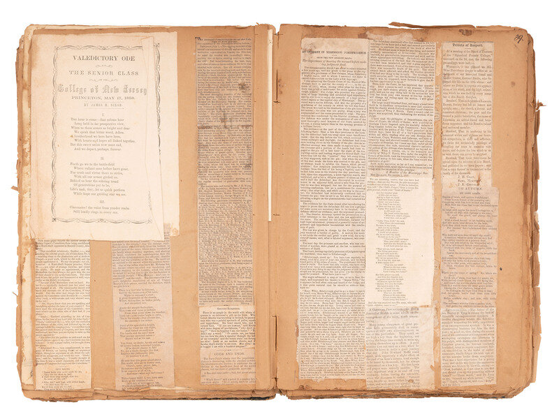 Scrapbook compiled by Andrew Todd McKinney, an 1858 College of New Jersey (later Princeton University) graduate and member of the school's prestigious American Whig Society. 15 3/4 x 10 3/4 in., marbled boards, approx. 170pp. (heavily worn, lacking spine, nearly all pages loose, heavily toned and chipping at edge lines). Additional items adhered to binding strips and enclosed within the scrapbook. Inscribed on front pastedown "Memorabilia Vol. 1 1852" and "A.T. McKinney / College of New Jer[sey] / Princeton / 50 N[?] / March 28th 1857."