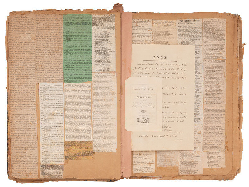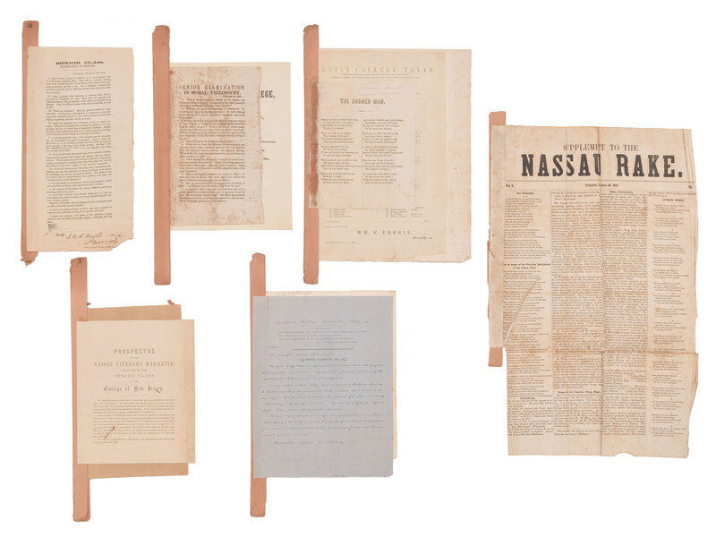 [With:] Additional ephemera related to the "College of New Jersey" includes: a scarce "Supplement to the Nassau Rake." Vol. 2 No. 1. Princeton, N.J. 29 June 1853. 1p, approx. 13 x 19 in. (creases, large tear running from bottom left to mid center, adhered to binding strip). The Nassau Rake was a humorous, satirical publication traditionally published by the sophomore class for the purpose of mocking the university, its students, teachers, and culture. This "Supplement" includes a poem "Our President" skewering College of New Jersey president James Carnahan (1775-1859), and "Lines on some of the Peculiar Individuals of the Junior Class." -- "Prospectus of the Nassau Literary Magazine, Conducted by the Senior Class of the College of New Jersey," Princeton, New Jersey, 10 May 1856, a plan submitted for "elevating the character of [the Nassau Literary] Magazine." -- "Senior Class: Examination in Rhetoric," Princeton [NJ]. 11 December 1856, and "Senior Examination in Moral Philosophy," 16 October 1857. -- College of New Jersey commencement program, 24 June 1857, on which McKinney has indicated with a "W" or "C" which speakers were members of the Whig and Clio debating societies. -- Multiple "Senior Orations" programs; newspaper clippings, and a small amount of ephemera from Austin College, Huntsville, Texas, an institution at which McKinney served as an instructor in the 1860s.