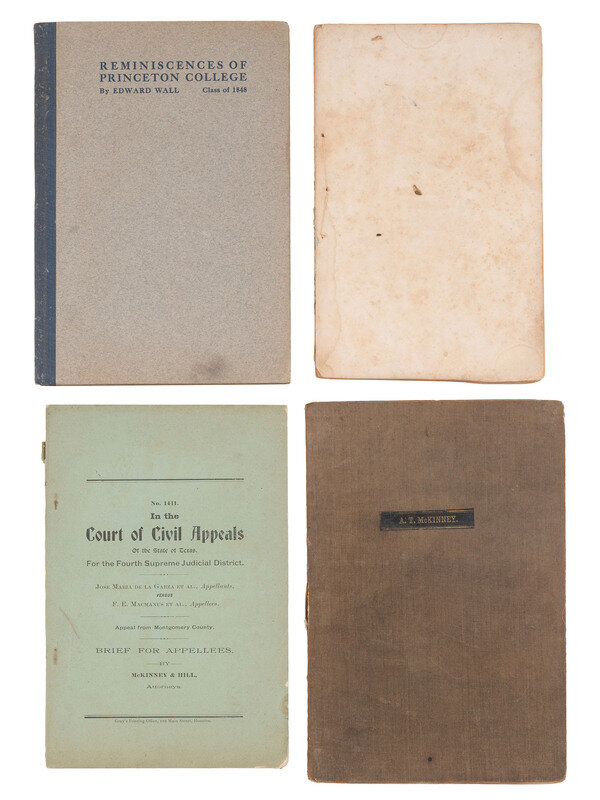 [Also with:] Several volumes and imprints identified to McKinney, including the "Catalogue of the American Whig Society, Instituted in the College of New Jersey, 1769." Princeton, N.J.: Published by Order of the Society, 1857. 84pp (lacking cover). Indicating Andrew T. McKinney of Mississippi as an undergraduate member. -- An assortment of other publications, mostly related to Texas history and McKinney's legal work and interests.
