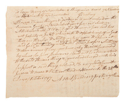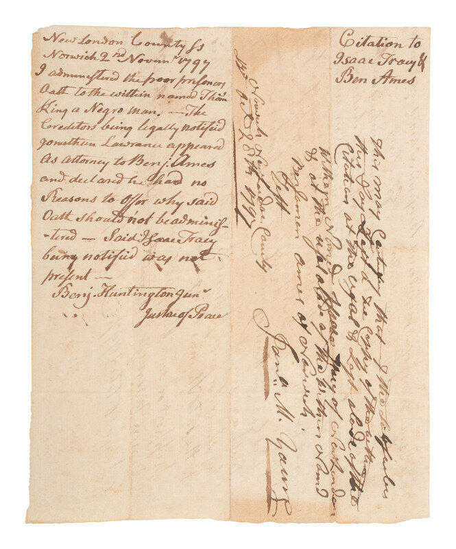 Sued by his creditors Isaac Tracy and Benjamin Ames, and unable to pay them, Thomas King was incarcerated in debtor's prison. Justice of the Peace Asa Spaulding summons Tracy and Ames to show cause why King did not deserve leniency from the court. The summons reads, in part: "Whereas Thomas King Negro man is now confined in the Common Gaol in Norwich...and it is said Thomas is poor and has not property or Estate where with to support himself in Gaol these are therefore to Notify each of oyu to appear at said Gaol in Norwich on Thursday next at 2 o'clock afternoon before some proper Authority to show reasons if any you have why the oath proceeded by Law for poor persons should not be administered to the said Thomas King & you stand charged with his support or said King released."