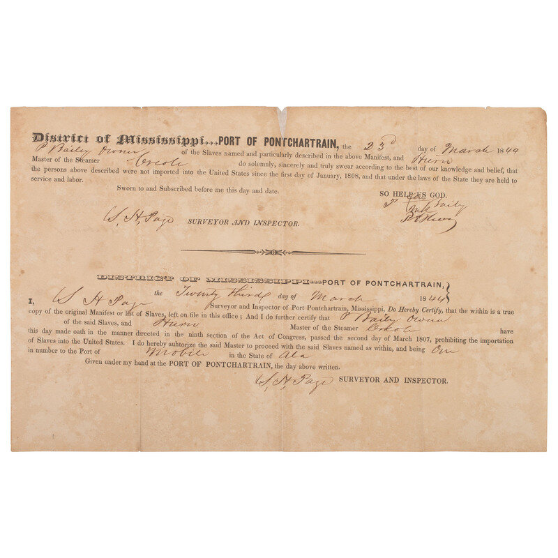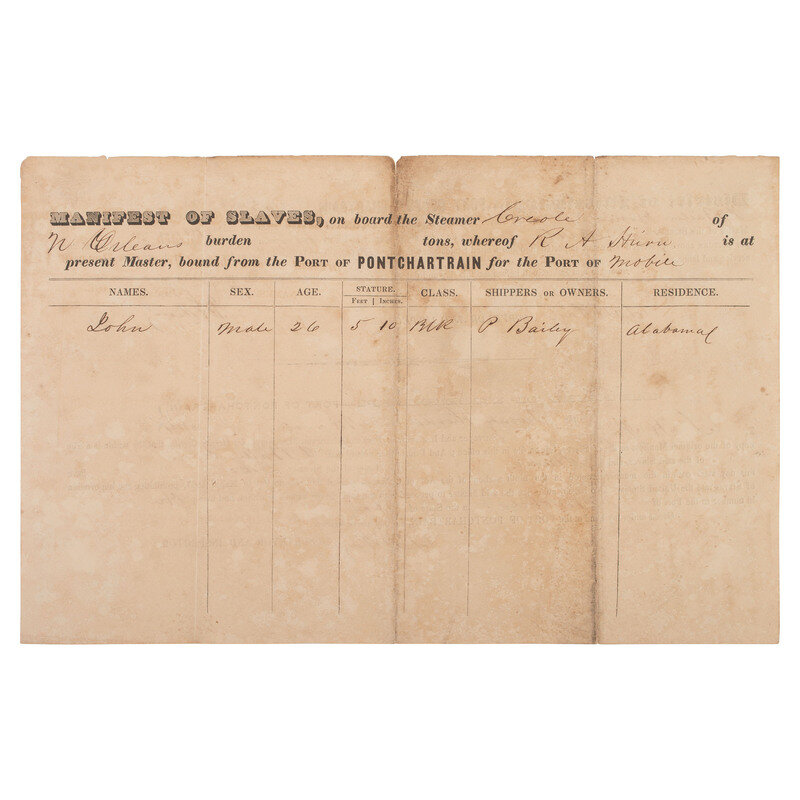 Partly printed ship's "Manifest of Slaves" documenting the conveyance of John, a 26-year-old enslaved man from Port Pontchartrain, District of Mississippi, to Mobile, Alabama. 23 March 1844. One page, printed recto/verso, 12 1/2 x 8 in.