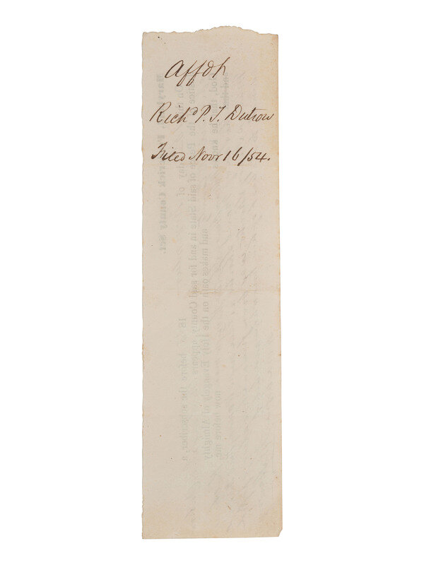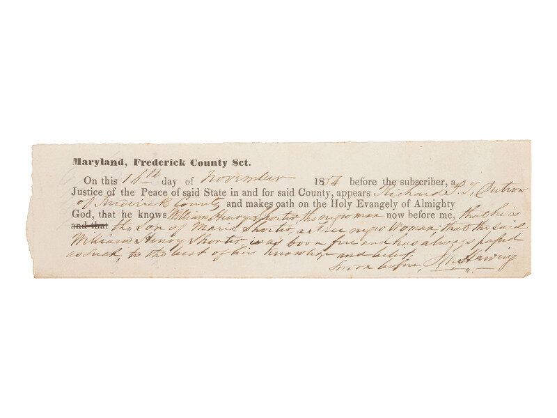 Partly-printed document, 1p, 2 x 7 1/2 in. (toning). Docketed on verso. Document indicates that Richard L.T. Dutrow of Frederick County made an oath that he knows "William Henry Shorter the negro man" and that "he is the son of Maria Shorter, a Free negro woman; that the said William Henry Shorter is as born free and has always passed as such, to the best of his knowledge and belief." Witnessed and signed by the Justice of the Peace for Frederick County, Maryland.