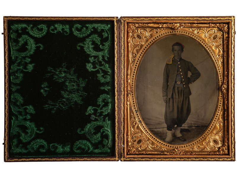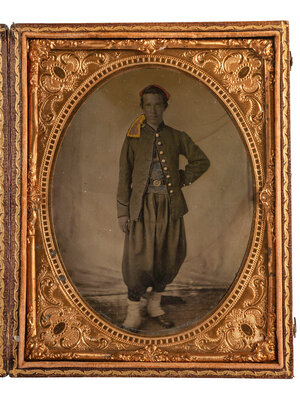 Though we cannot match all of the elements of this young private's uniform to a particular regiment with certainty, the combination of red headgear and blue sash was known to be worn by the 114th Pennsylvania, "Collis' Zouaves," which could be a reasonable attribution. Additionally the "Excelsior" inscription behind the image could point to New York's Excelsior Brigade as another possibility.