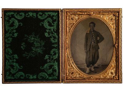 [CIVIL WAR]. Half plate tintype portrait of a Union soldier, likely a Zouave.