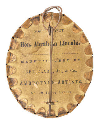 Ambrotype portrait of Abraham Lincoln featuring Mathew Brady's famous "Cooper Union" pose, approx. 2 x 1 1/2 in. (sight), set in an oval pin-backed brooch, approx. 2 1/2 x 2 1/8 in. overall. Reverse with original printed label made of coated stock, inscribed "For President, Hon. Abraham Lincoln. Manufactured by Geo. Clark, Jr., & Co., Ambrotype Artists, No. 59 Court Street, Boston."