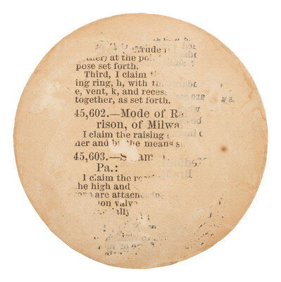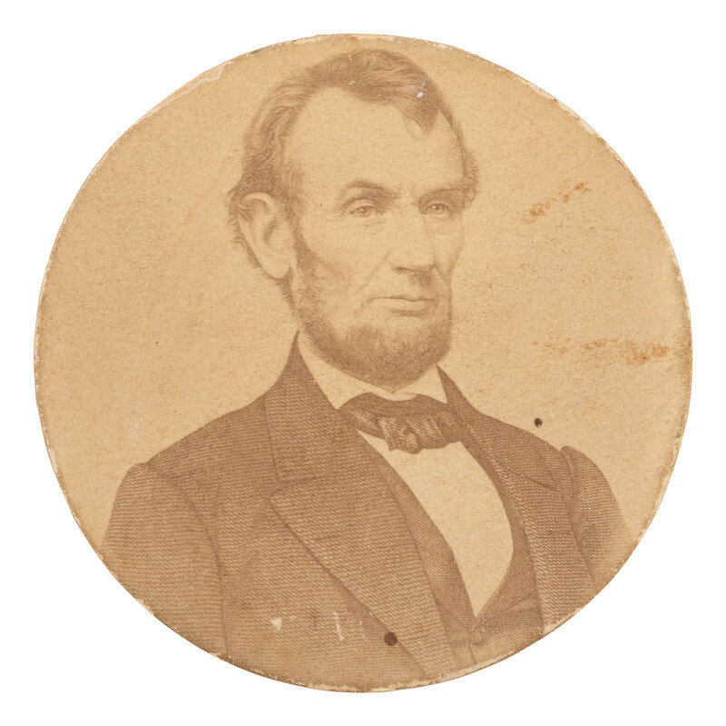 [With:] Circular albumen portrait of Abraham Lincoln, approx. 2 1/8 in. dia., with printed information on verso that does not appear to relate to the image, which may have been produced for use campaign or memorial purposes. (Toning and some soiling to print; surface loss to verso.)