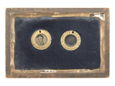 Brass and ferrotype token, images approx. 12 mm dia., token 25 mm dia. Obverse with ferrotype image of a beardless Lincoln, reverse with vice presidential candidate Hannibal Hamlin. Each side stamped with the candidate's name and "1860." (Some surface scratches to Lincoln portrait; surface loss to right edge of Hamlin portrait; some surface wear to token.)